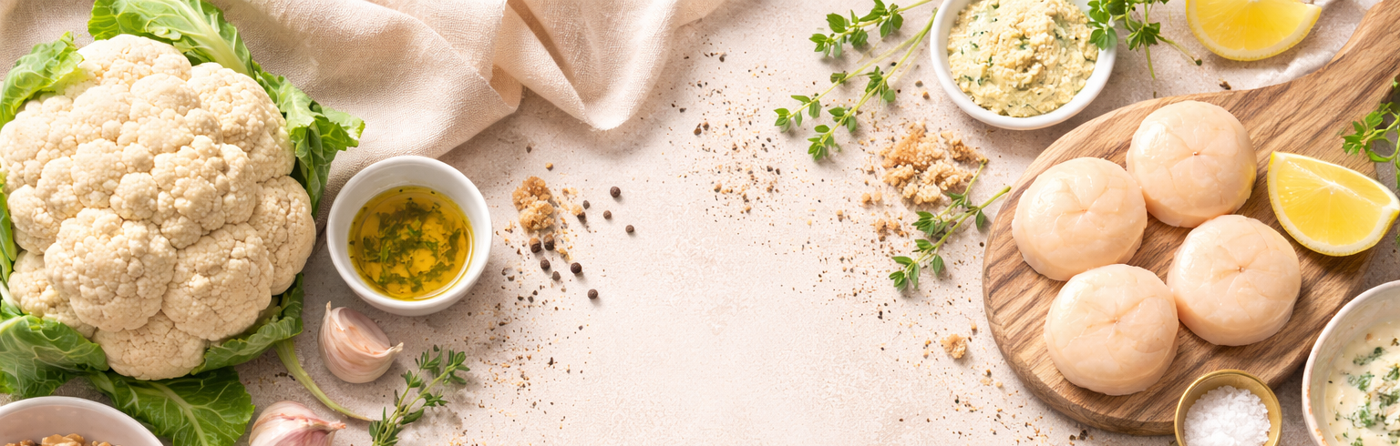 Purée de chou-fleur et noix de Saint-Jacques snackées