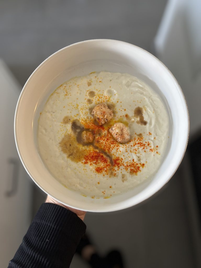 J’avais envie de proposer quelque chose d’un peu différent : simple, mais qui change. Le chou-fleur traînait dans mon frigo, les Saint-Jacques me faisaient de l’œil chez le poissonnier… et l’idée est née comme ça. Une purée bien lisse, ultra crémeuse, presque réconfortante, et des noix juste snackées à la poêle, dorées à l’extérieur, fondantes à l’intérieur.